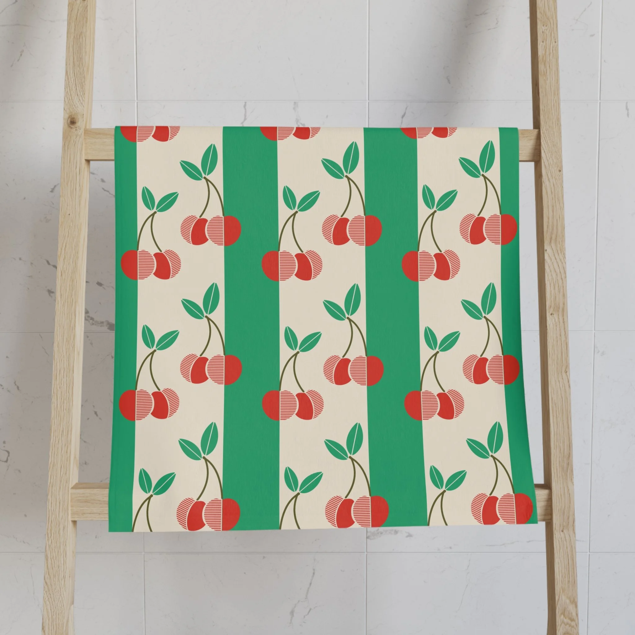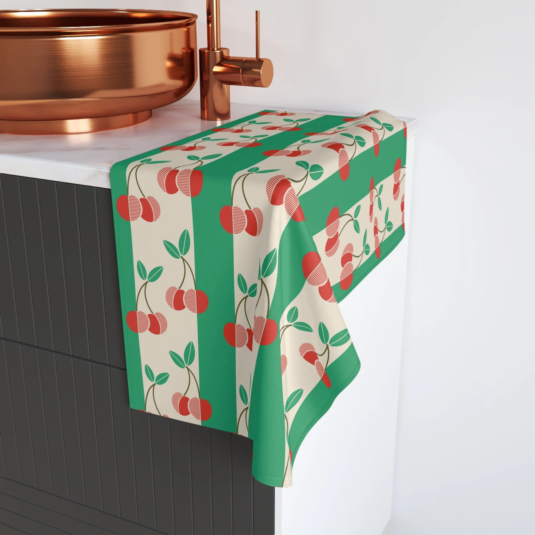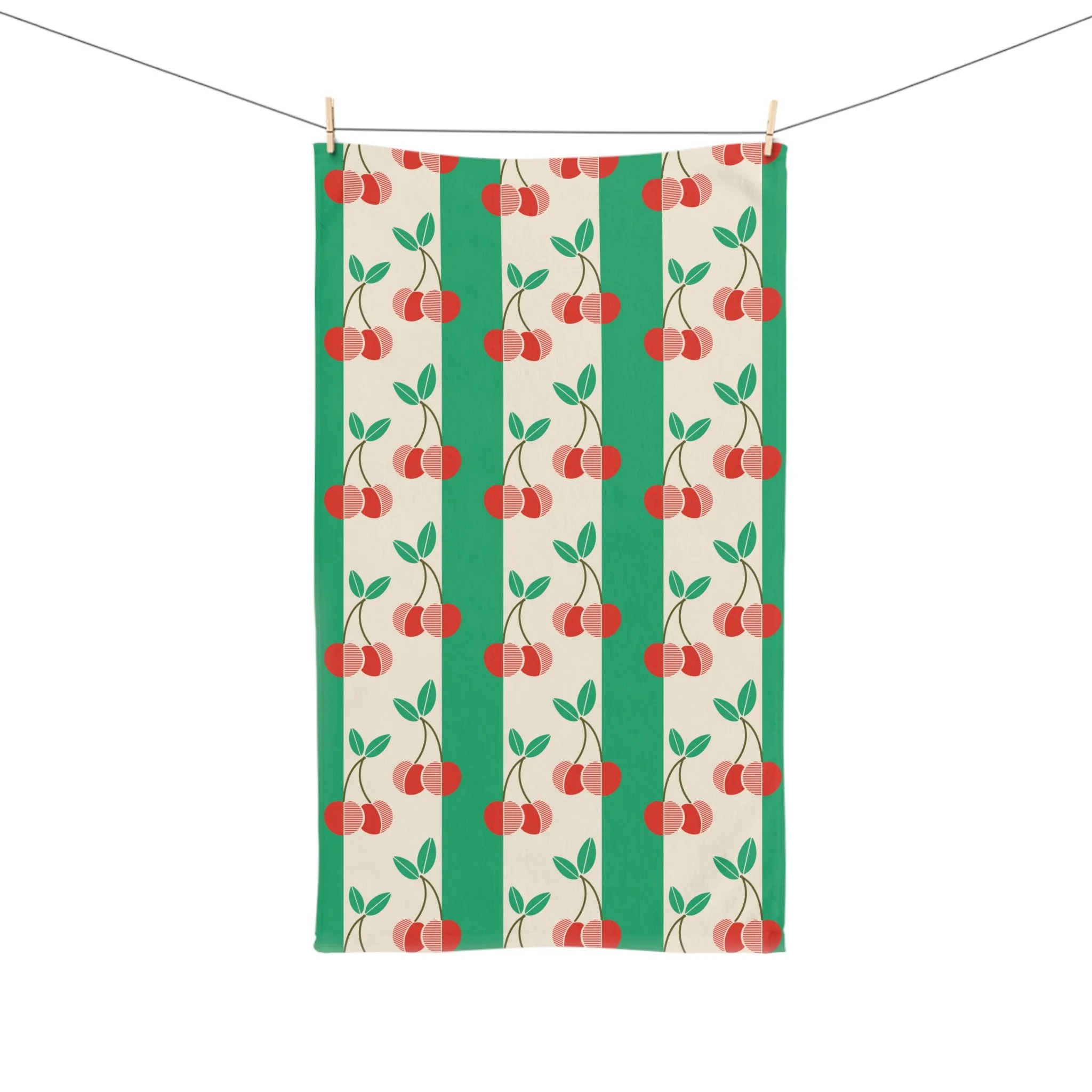 Bright, cheery hand towel with a playful cherry stripe pattern that brings a vintage-yet-modern kitchen mood. Soft, lightweight fabric feels gentle on hands while absorbing spills and drying quickly. The repeating cherry motifs and bold green stripes add a nostalgic, retro flair making this towel suited for someone who loves curated, joyful details — home cooks, brunch hosts, and lovers of mid-century patterns. It complements cozy gatherings like weekend breakfasts, summer picnics, or housewarming moments when a little pattern makes the kitchen feel finished. Use it daily for drying hands, lining a bread basket, or brightening a guest bathroom.